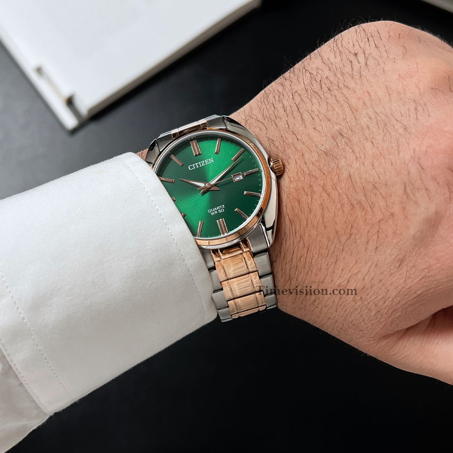ساعت سیتیزن BI5104-57Z یکی از ساعت های کلاسیک مردانه برند CITIZEN است. یک ساعت حرفه ای زیبا با صفحه نمایش سبز خاص که به دلیل رنگ خاص صفحه نمایش و بند استیل دو رنگش زیبایی خاصی دارد. این ساعت یک ساعت ضد آب است که تا عمق 50 متر می تواند فشار آب و رطوبت را تحمل نماید. بدنه این ساعت به گونه ای ساخته شده که از وارد شدن رطوبت و آب به داخل ساعت و بروز آسیب به موتور ساعت جلوگیری می کند. این موضوع باعث شده تا مدل BI5104-57Z به یک ساعت مقاوم و با عمر مفید بالا تبدیل شود.